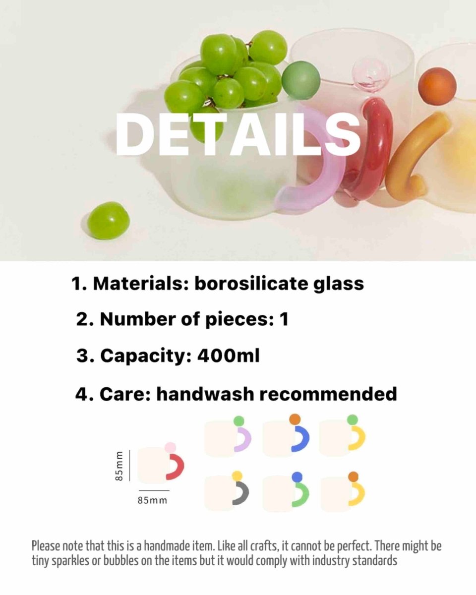 Your mugs speak a lot about you and set a tone for your day ahead. With this notion in mind, Candy Mug was created to set you up for a cheerful day while also shouting out your unique taste & openness at home or at work. Handmade by skilled artisans, these cute mugs are well constructed with sturdy, scratch-resistance borosilicate glass and thoughtfully designed with a sideling handle to facilitate easy grasp. From the vibrant colors, to playful bubbles, to the frosted texture, every detail is fine-tuned to perfection, making this exquisite coffee mug a décor on your table and a conversation piece in your office